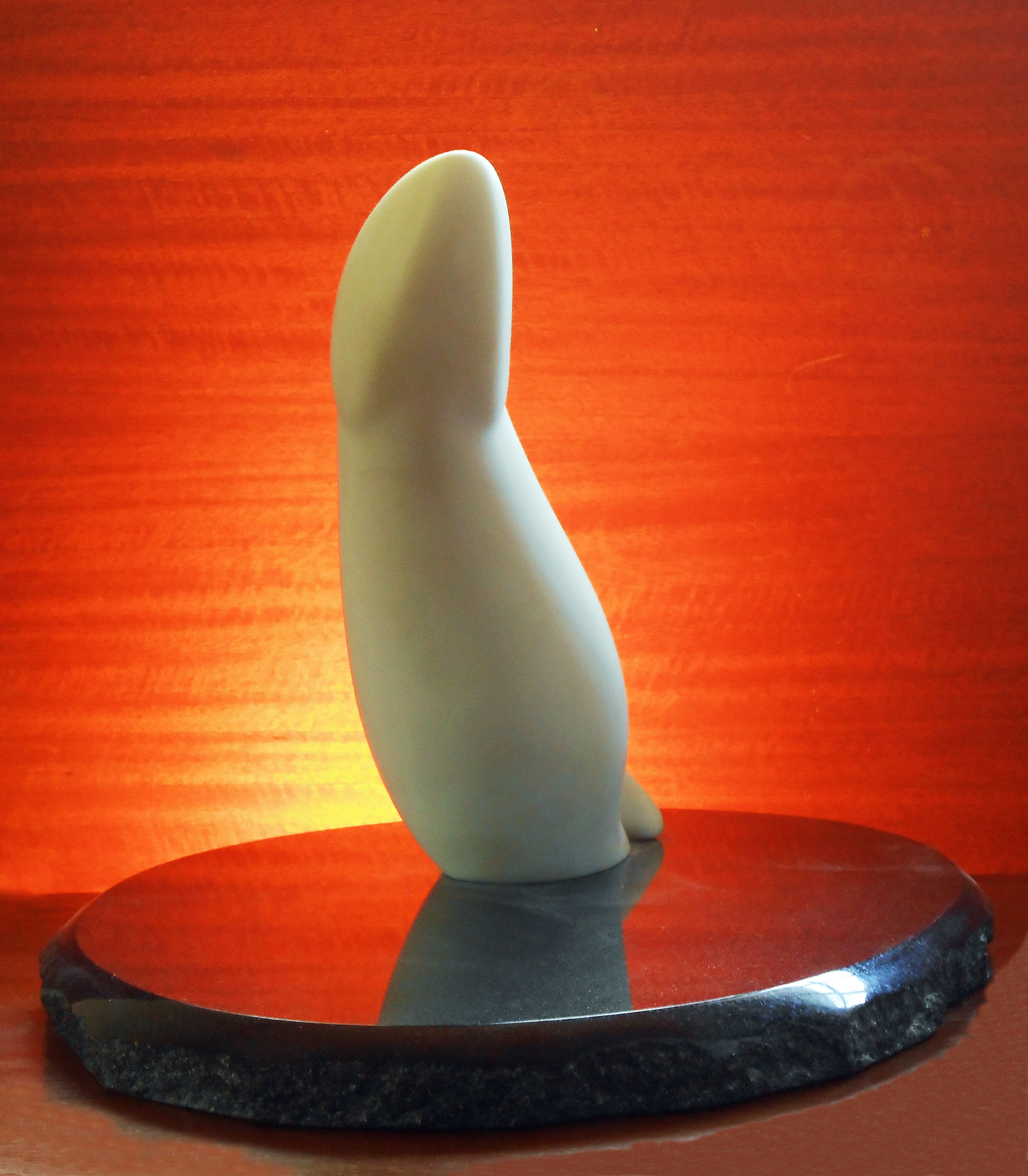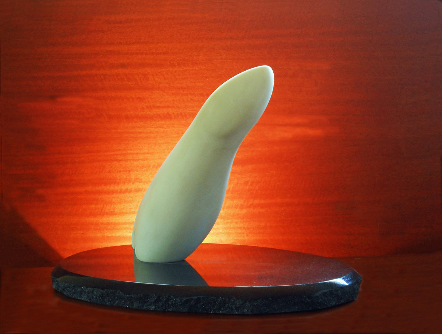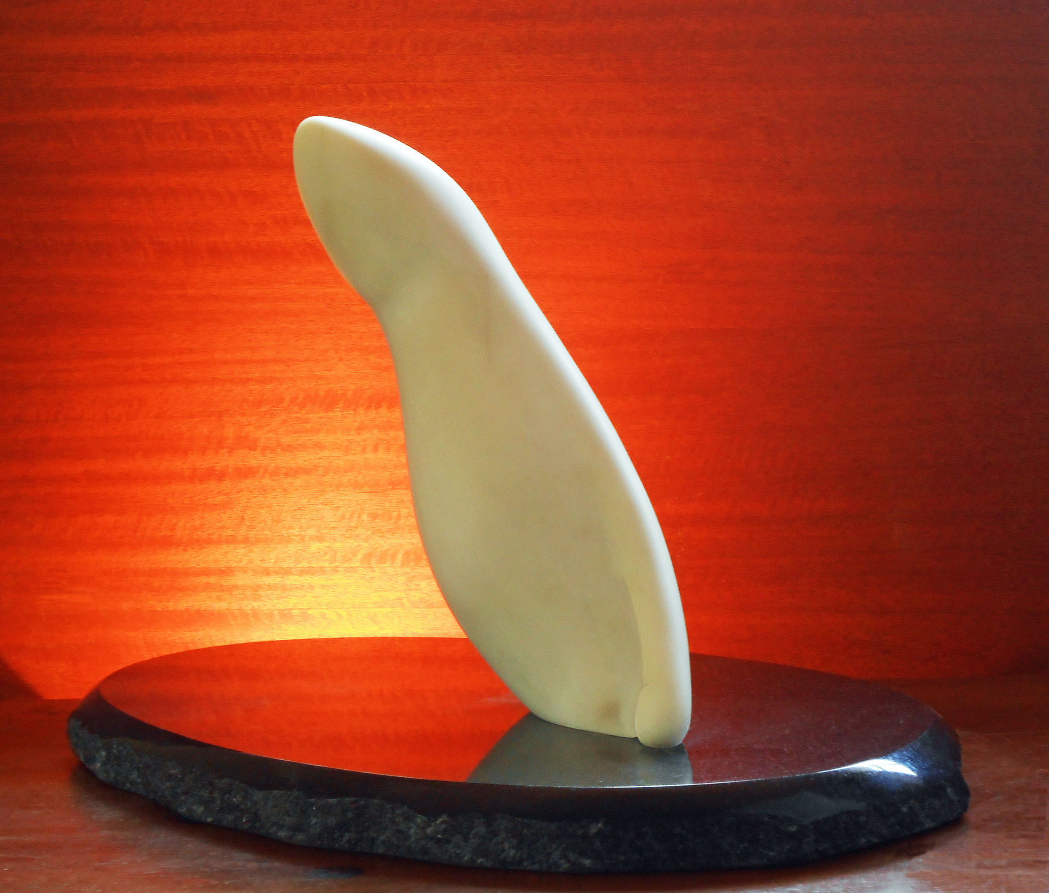 “Fish Jumping in Moon Light”, white Carrara marble, 11” h x 10” h X 4” deep, Black granite base, 18.25” w x 13” deep x 1.25” h unique, 2017