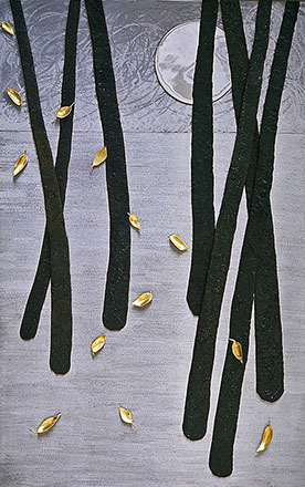 "Autumn", stainless steel, bronze & gold leaf, 49" h x 31" w, unique, 1995.