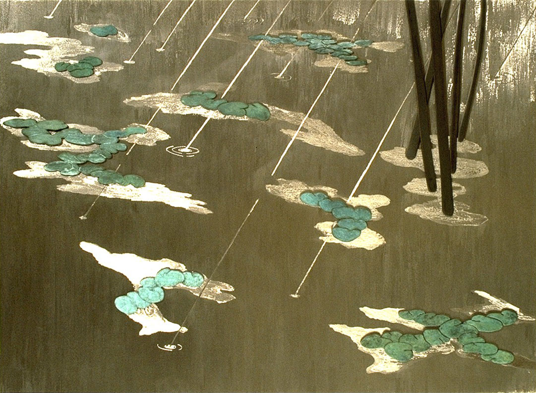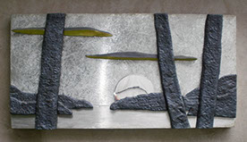 "Rain, Reeds and Water Lilies", stainless steel and bronze, 35" h x 48" w, • Viewer movement left or right gives visual jump of reflective light., unique, 1998.
