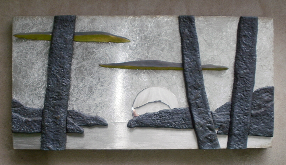 "Glacier Lake" stainless steel, bronze & gold leaf, 24" h x 48" w, unique, 1992